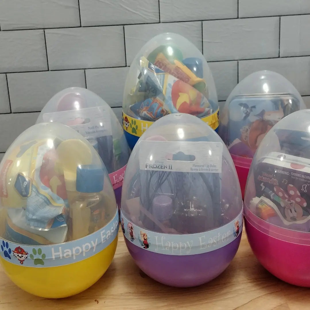Our 6-inch eggs are personalized with your child's name, filled with candy, and include a misc. item of your favorite character and other additional gifts!