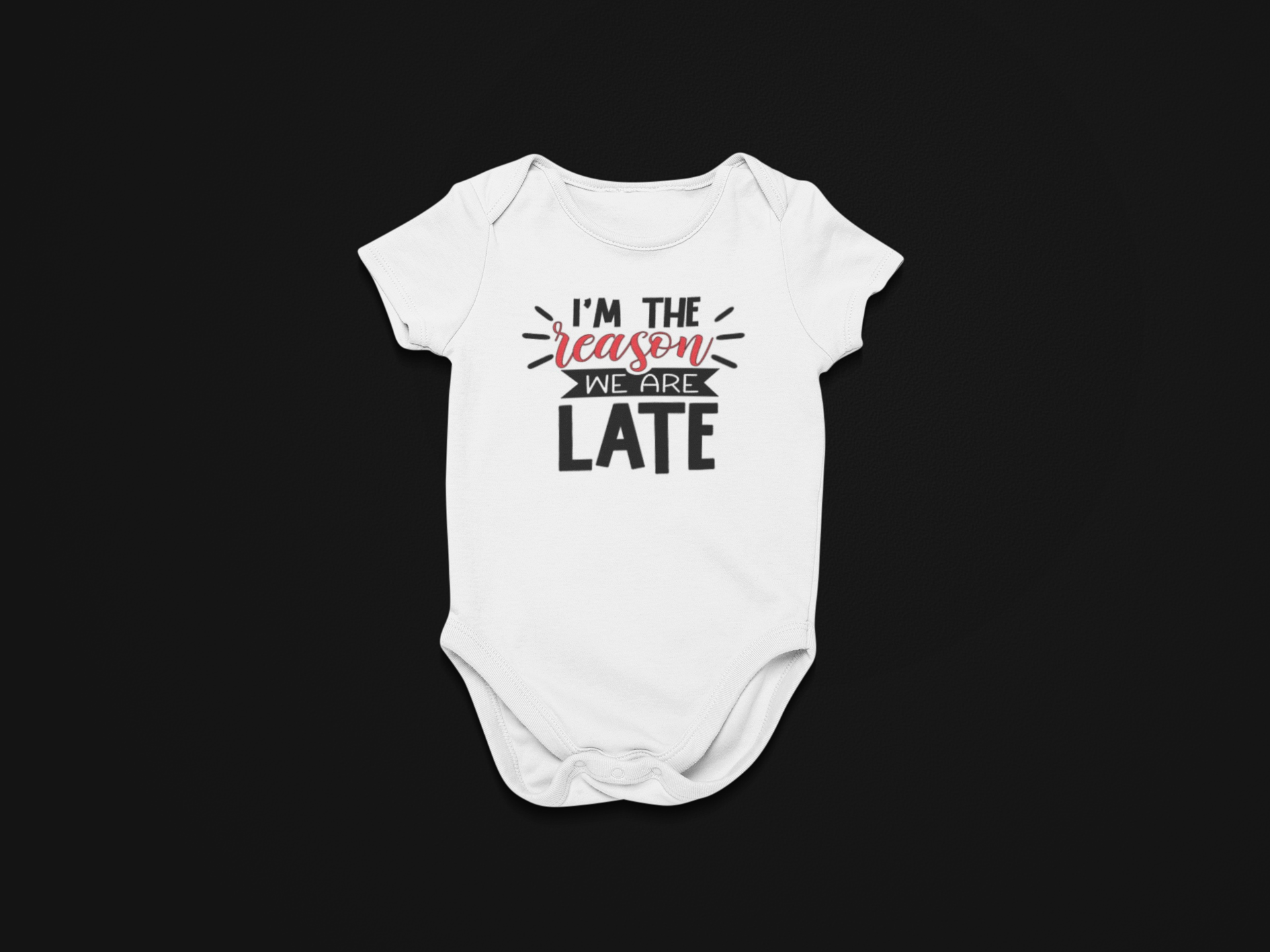 How often do you blame the baby? Are you late because of a last-minute diaper change? or temper tantrum? This humorous onesie explains it all, "I'm the reason we're late"