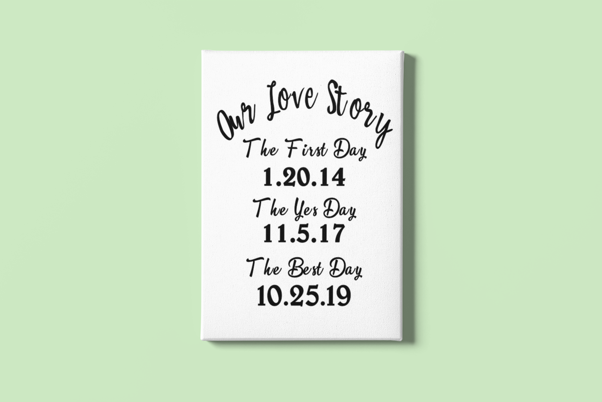This 8"x11" canvas displays the couple's first day, yes day and best day! Display this canvas in your home to remember the special days in your life